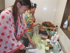 いもをひとつづつハサミで切って